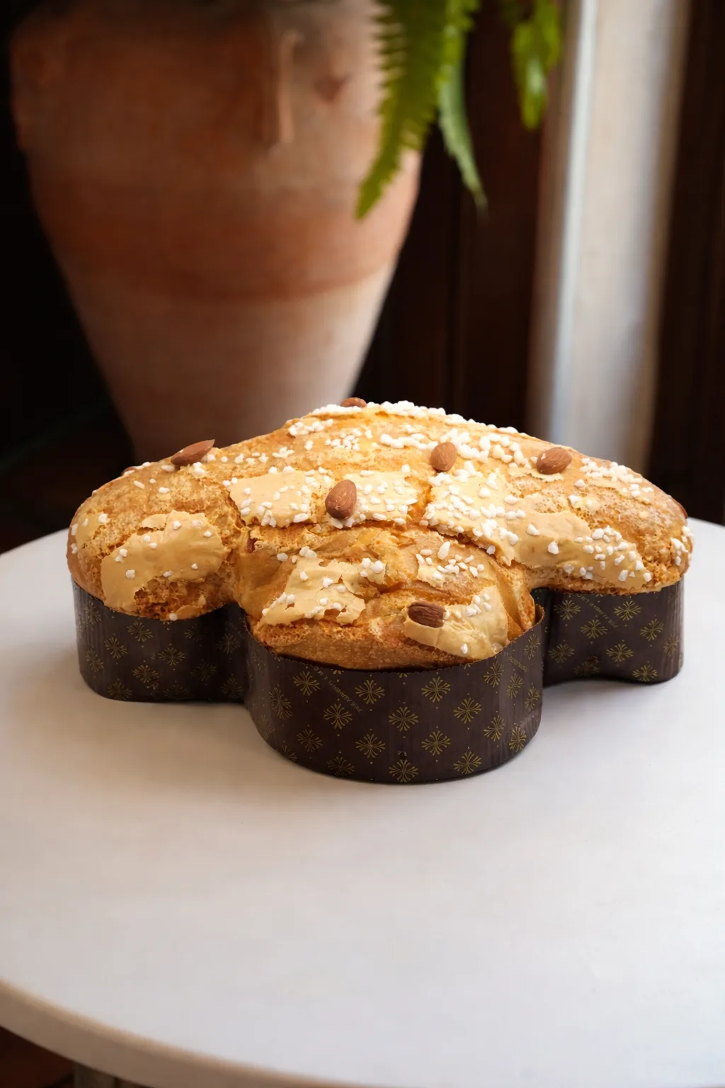 Colomba artigianale pasquale con lievito madre, arancia candita e glassa di mandorle e nocciole. Eccellenza della Pasticceria Caffè San Romolo di Sanremo.