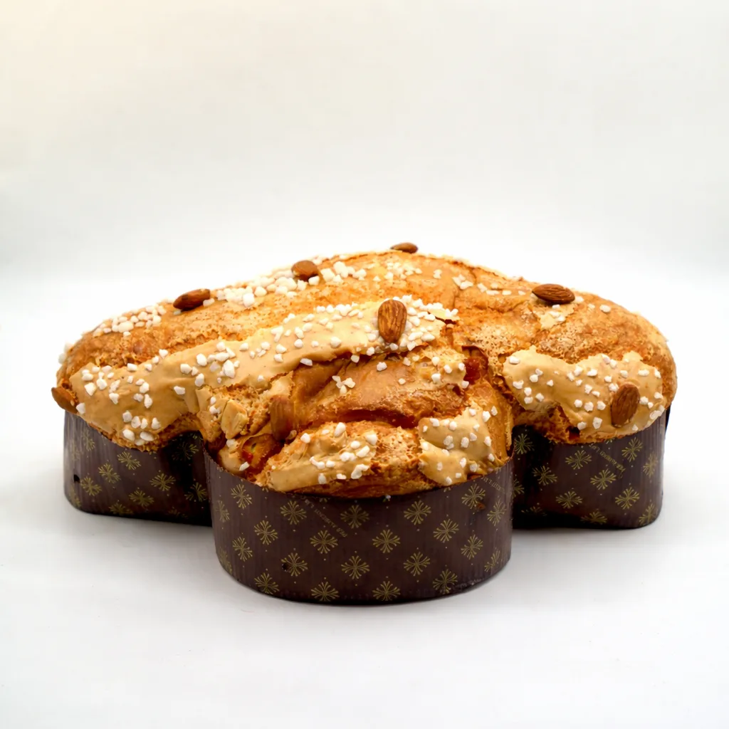La Colomba Artigianale San Romolo è il dolce simbolo della Pasqua, realizzata con lievito madre naturale e una lunga lievitazione che le conferisce una morbidezza unica. L’impasto profumato all’arancia candita è ricoperto da una croccante glassa di mandorle e nocciole con granella di zucchero.